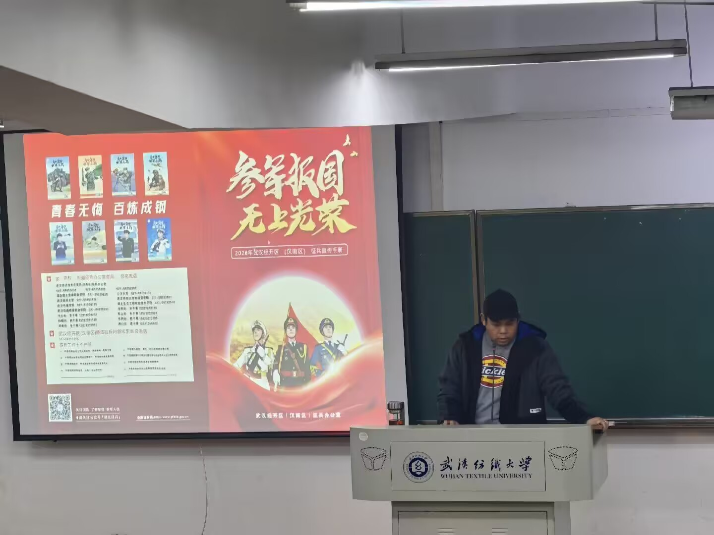 1月23日晚6点-7点,威廉希尔足球网于7教T-201开展“携笔从戎砺青春,热血报国正当时”主题班会暨征兵宣传“三个一”活动,本次大会由党委学生工作部、武装部统筹,2023级、2024级、2025级全体同学共同参与,辅导员朱一雷主持会议。