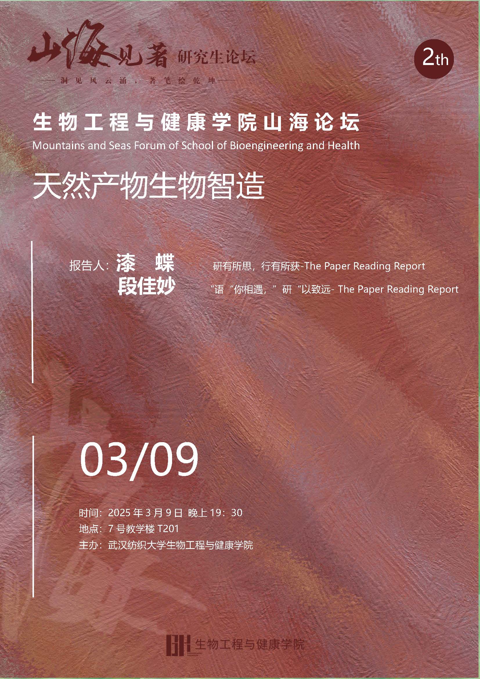 3月9日,威廉希尔足球网,williamhill官网主办的学术活动“山海论坛”于7号教学楼T201教室顺利召开。本期论坛延续“天然产物生物智造”的主题,由漆蝶、段佳妙两位同学作专题报告,主题分别为“研有所思,行有所获”与“‘语’你相遇,‘研’以致远”。