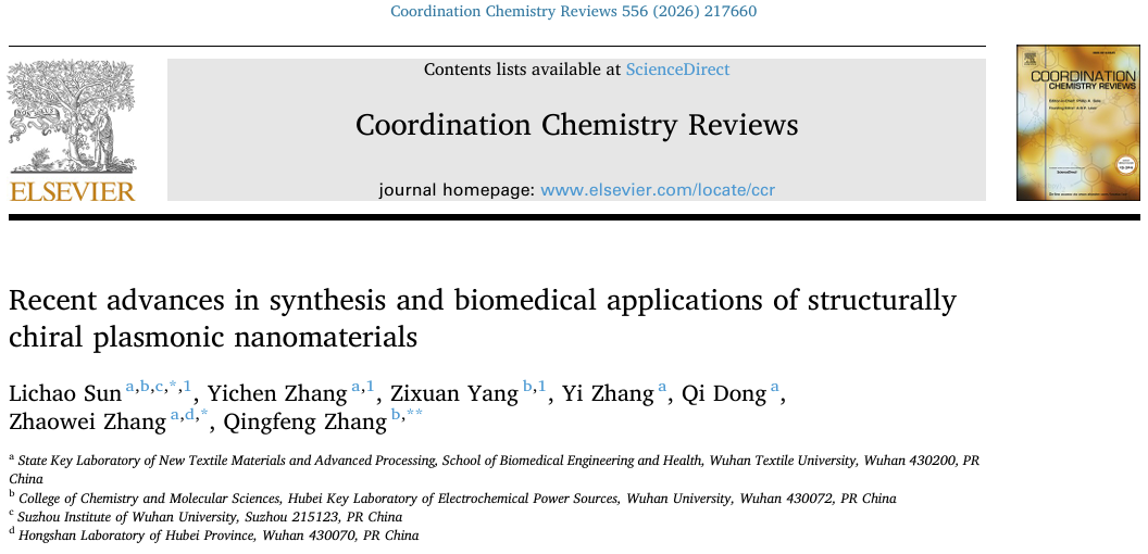 近日,张兆威团队与武汉大学张庆丰合作,在国际知名综述期刊《Coordination Chemistry Reviews》发表了题为“Recent advances in synthesis and biomedical applications of structurally chiral plasmonic nanomaterials”的综述论文(https://doi.org/10.1016/j.ccr.2026.217660)。孙丽超副教授为第一作者,生医工专业硕士研究生张亦琛为共同第一作者。Coordination Chemistry Reviews是中科院一区TOP期刊,涵盖从基础理论、合成表征到材料科学、生物无机化学、医学及能源应用等广泛领域。