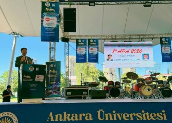 据悉,APA国际会议由陈子林教授于2017年在武汉大学发起并首次举办,此后,法国里尔大学、中国西安交通大学、法国洛林大学、中国清华大学、波兰格但斯克医科大学、土耳其安卡拉大学先后承办了第二至第七届会议,现在已发展成为国际上有重要影响力的药物分析国际会议,为我国向世界讲好中国药物分析故事提供了重要的国际交流平台。经大会学术委员会研究决定,第八届APA 会议将由我校承办,陈子林教授与张兆威教授任大会主席,陈子林教授在闭幕式上对APA 2026-武汉进行了宣讲(图2),并向参会代表发出参会邀请。
