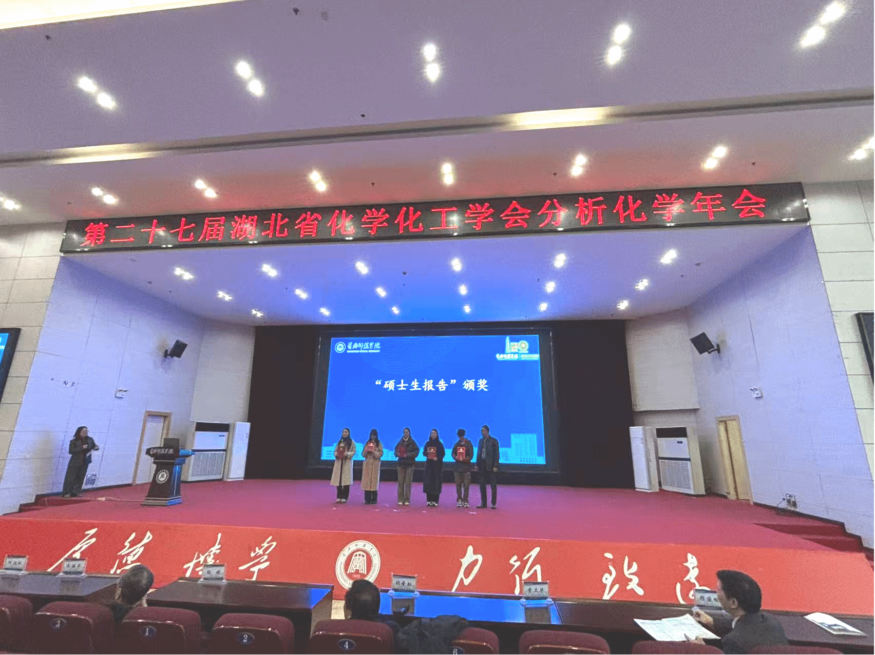湖北省化学化工学会分析化学年会是我省分析化学领域高层次、高水平的学术交流平台,旨在促进学术创新与合作。本届年会于2025年11月21日至23日在黄冈举行,汇聚了来自全省众多高校与科研机构的专家学者及优秀学子。在紧张而精彩的学术报告比赛中,蒲章洁同学以其扎实的专业基础、创新的研究内容和清晰的现场表述,赢得了评委的普遍认可,最终从众多参赛者中脱颖而出。