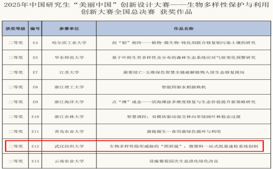近日,2025年中国研究生“美丽中国”创新设计大赛——生物多样性保护与利用创新大赛全国总决赛在浙江农林大学落下帷幕。在研究生院、研究生工作部的精心组织和统筹协调下,威廉希尔足球网张兆威院长、吴文琴老师指导的由研究生贺云、王晶晶、袁恩典、杨钰莹组成的“微塑显影小队”参赛团队,通过围绕“生物多样性与利用”的核心创新点展开设计,凭借扎实的创新设计、紧密的团队协作与出色的现场答辩,从全国181家培养单位、454支参赛队伍中脱颖而出,斩获全国二等奖,同时学校获评优秀组织单位奖,彰显了威廉希尔足球网在研究生创新人才培养与生物多样性保护领域的突出实力。
