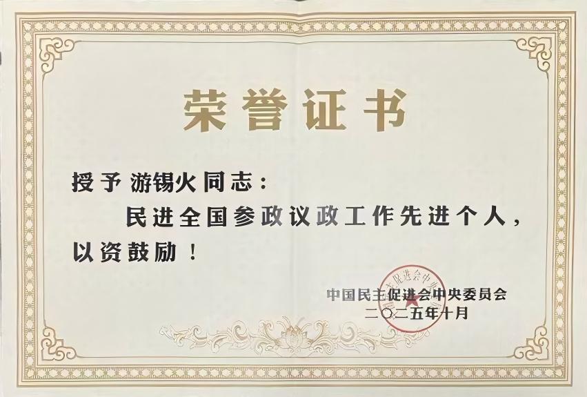游锡火教授自2012年加入中国民主促进会以来,始终以高度的政治责任感和专业使命感投身参政议政工作,坚持“立足实践、聚焦民生、服务大局”的原则,近五年牵头或参与完成调研课题10余项提交提案、社情民意信息20余件。其中《关于在“-带一路”国家进行包虫病联防联控的建议》《关于将中兽医药传承创新纳入国家中医药传承创新发展的建议》多篇建议被全国政协采纳,先后荣获北京民进优秀会员、“湖北民进70年双岗建功”优秀会员等称号。