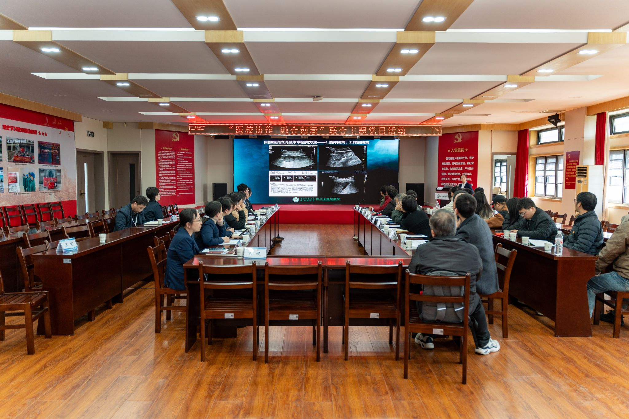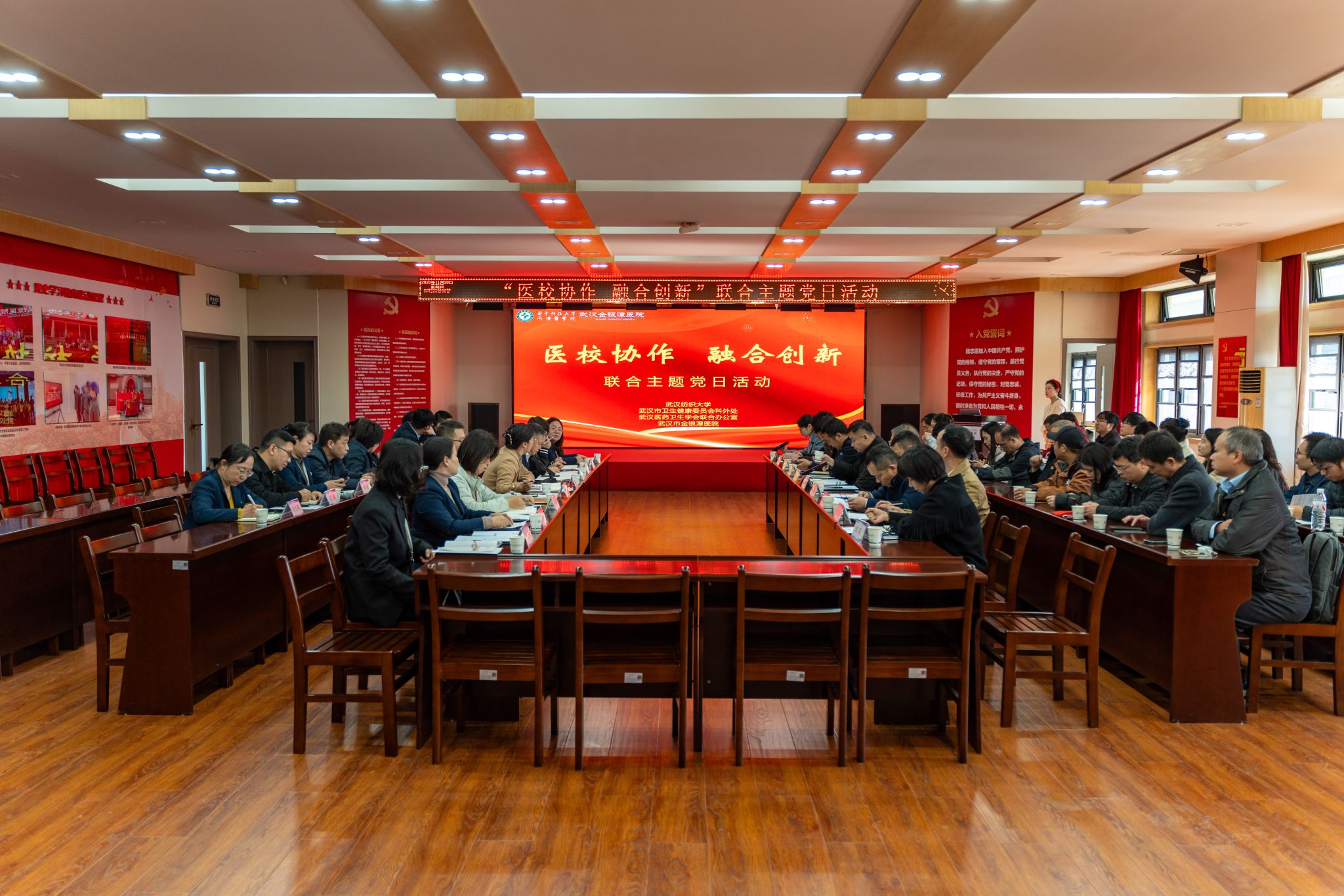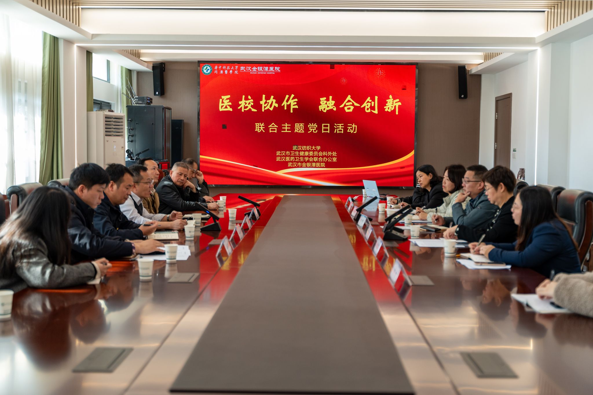 为深入贯彻落实习近平总书记关于科技创新与产业创新深度融合、培育新质生产力的重要指示精神,以党建为纽带推动医教研协同走深走实,11月20日上午,威廉希尔足球网科学技术发展院党支部、生物医学工程与健康学院党总支及数学与统计学院党委,与武汉市卫生健康委员会科技外事处党支部、武汉医药卫生学会联合办公室联合支部一起,走进武汉市金银潭医院,开展了一场主题鲜明、内容生动的“医校协作 融合创新”主题党日活动。各方围绕学科交叉与协同创新路径展开深入交流,共同为筑牢人民健康屏障汇聚新合力、注入新动能。