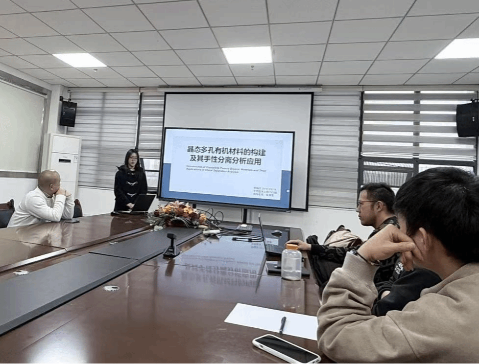 罗瑞欣同学在张清璞老师的指导下,以“晶态多孔有机材料的构建及其手性分离分析应用”为题进行汇报。针对手性分离分析技术的核心手性材料制备复杂,难以大规模批量生产,成本高的问题,团队采用界面聚合的方法高效制备长程连续的晶态多孔有机材料(CPOMs)并对其进行相应表征,后续将继续进行性能表征测试,并将CPOMs 与玻碳电极集合制备手性电化学传感器,从而为快速便捷的手性分析提供方案。