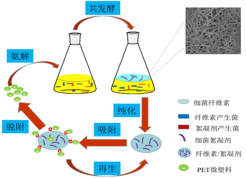 图 2. 以涤纶微塑料为原料持续合成细菌纤维素/絮凝剂复合材料示意图